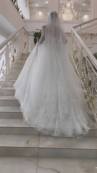 This captivating gown features a glittery fabric that gently shines with every move the bride makes, creating a magical sparkle that will draw the attention of everyone present. The beaded lace that decorates the dress adds uniqueness and luxury to it.
